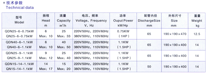 2、QDN型系列微型不銹鋼潛水泵配套功率、WQ潛水排污泵;工作電壓