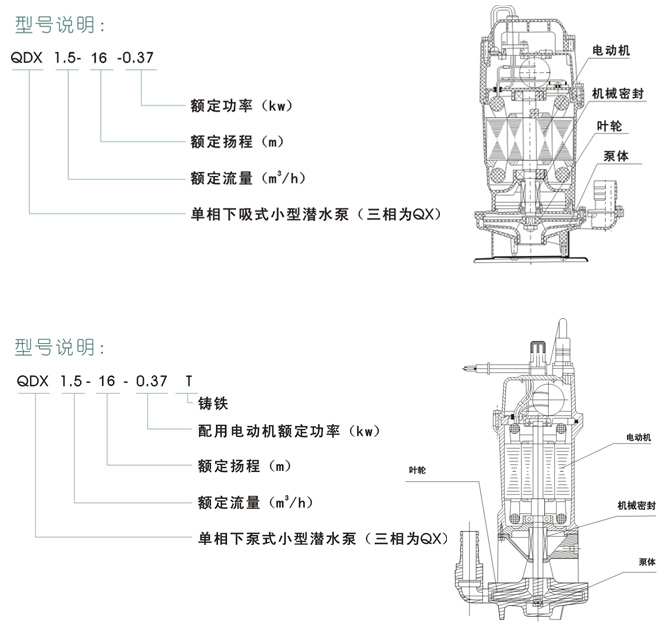 QDX、QX型潛水電泵(以下簡稱電泵),由水泵、密封、電動機三部分組成。電泵內配保護裝置,電動機位于電泵上部,為單相或三相異步電動機,水泵位于電動機下部,為離心式葉輪,蝸殼結構,水泵與電動機之間采用雙端面機械密封,各固定止口密封處采用“O”形耐油橡膠密封圈作靜密封。