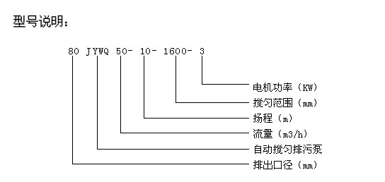 二、JYWQ型系列自動攪勻排污泵型號說明 注:JYWQ為普通型自動攪勻排污泵;JPWQ為帶不銹鋼外套內循環冷卻系統的自動攪勻排污泵
