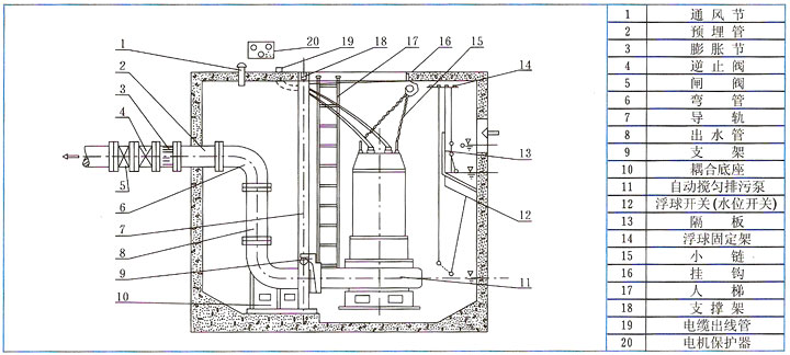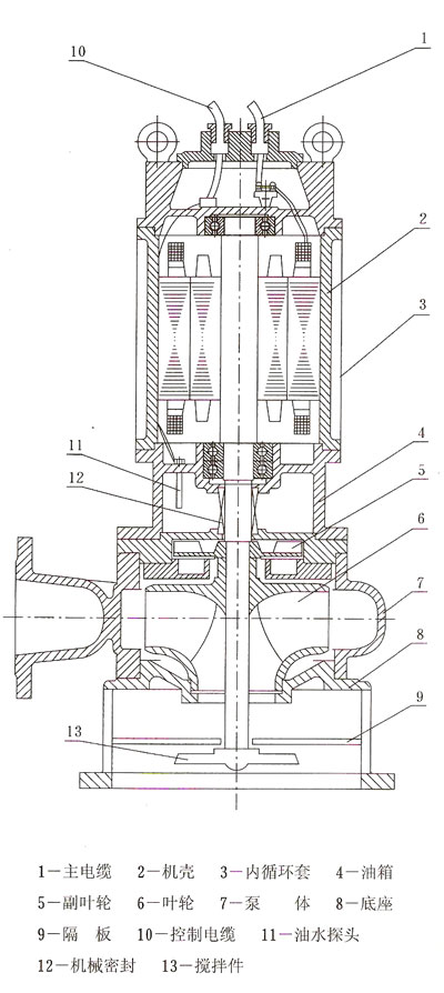 七、JYWQ型系列自動攪勻排污泵結構示意圖及說明 ![]() 1、采用獨特的雙流道無堵塞葉輪結構,提高污水污物的過流能力和排污能力。